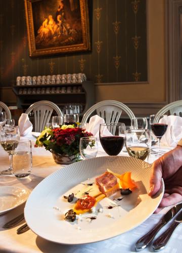 Om så önskas kan du beställa à la carte-rätter tillagade med säsongens råvaror till lunch och middag. När vädret tillåter avnjuter du din mat ute på terrassen. I baren erbjuds många goda drycker.